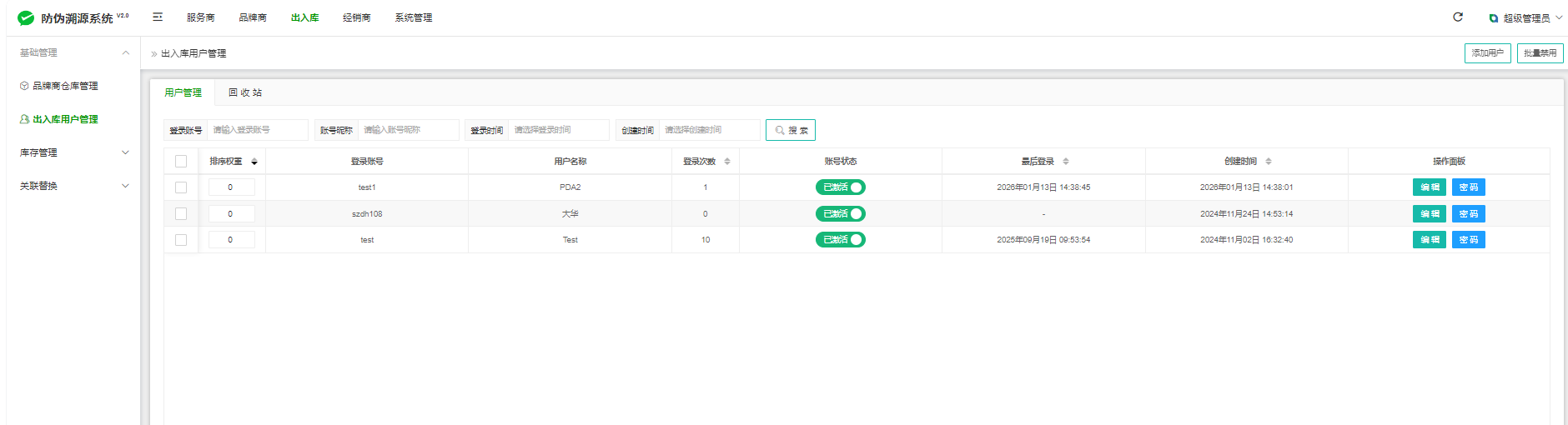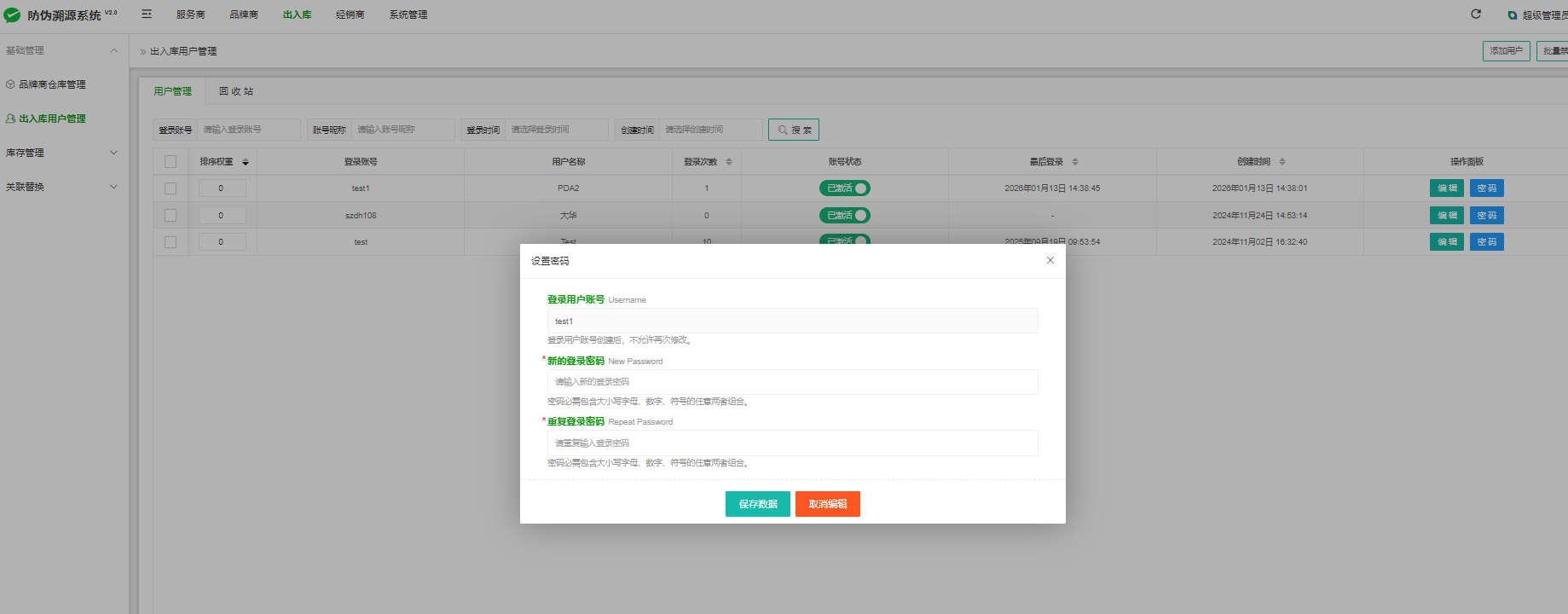 设置:出入库--基础管理--出入库用户管理--选择新添加用户--操作面板--设置密码