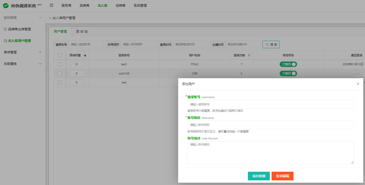 设置:出入库--基础管理--出入库用户管理--添加用户
