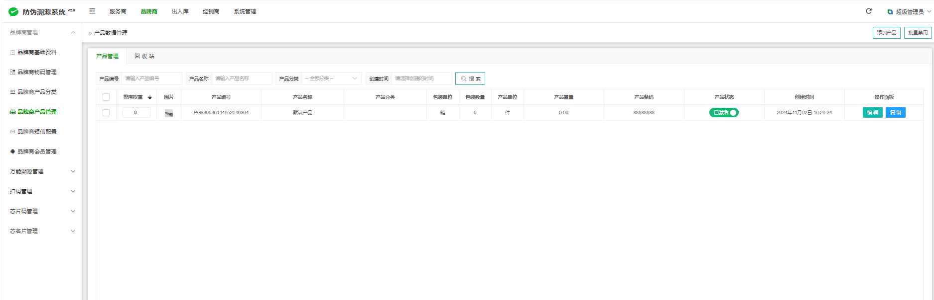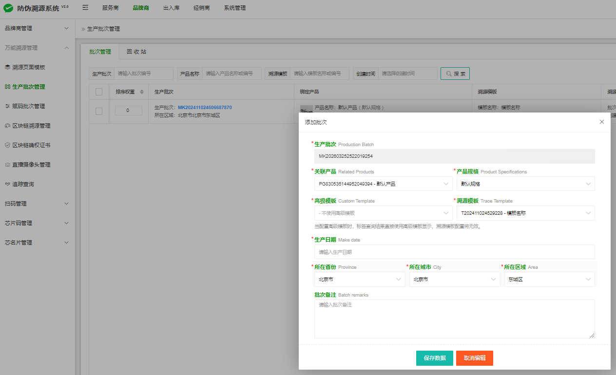 设置:品牌商--万能溯源管理--生产批次管理--添加批次