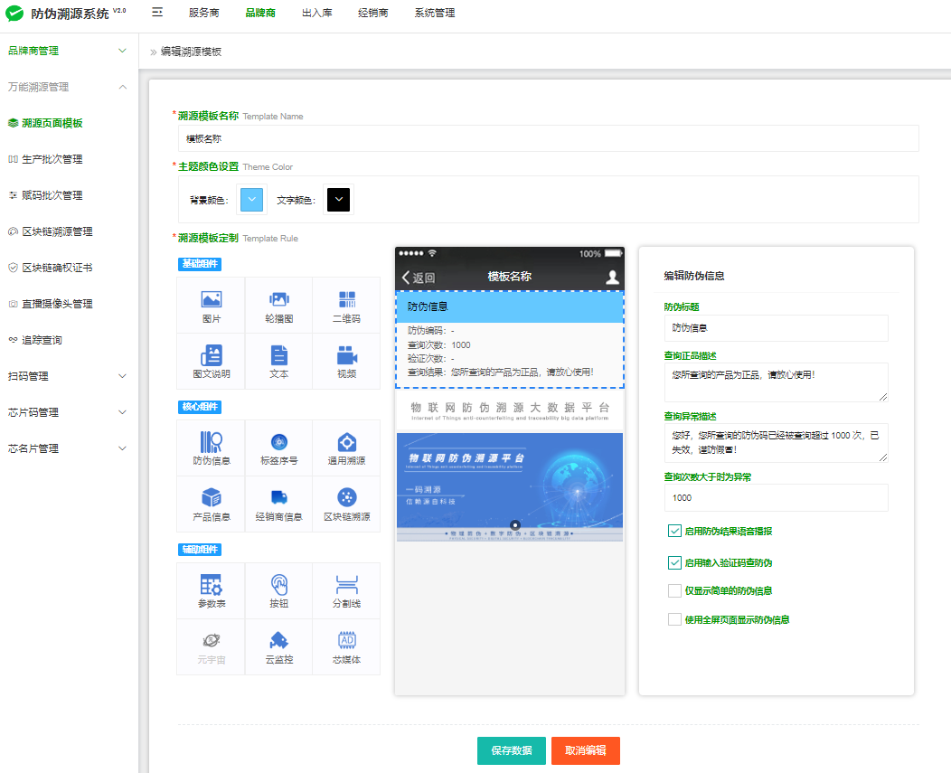 设置:品牌商--万能溯源管理--溯源页面模板--添加模板